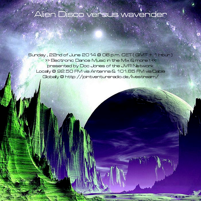 Am So., den 22. Juni von 18 bis 20 Uhr wird es die Sendung „Alien Disco versus waverider“ – live und direkt aus dem „Ivory Tower“ Studio in Bremen-Grohn – mit einem neuen DJ Mix und noch einigen von Doc Jones individuell ausgewählten und präsentierten Stücken geben! 😀