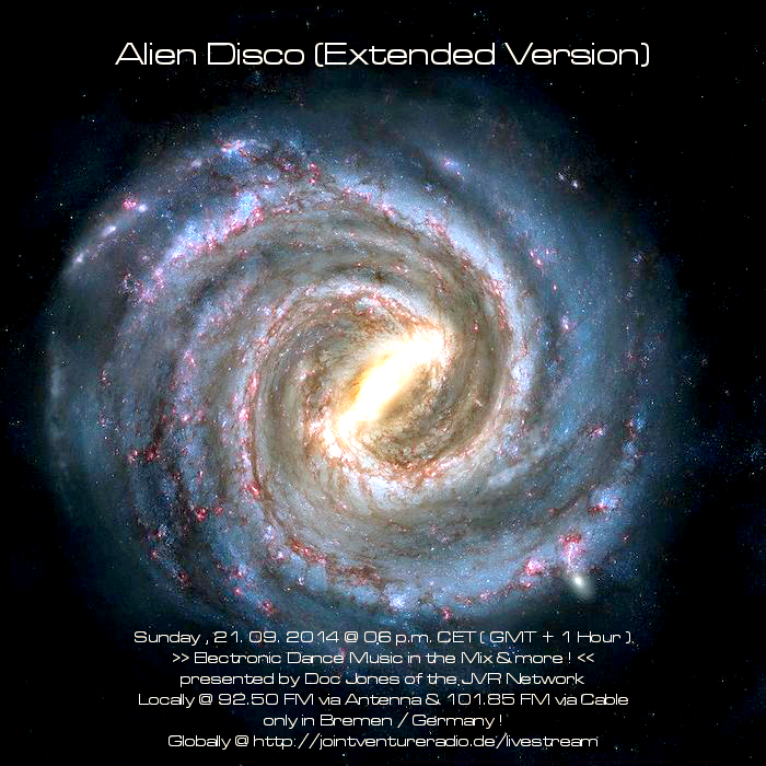 Am So., den 21. September von 18 bis 20 Uhr wird es die Sendung „Alien Disco (Extended Version)“ – dieses mal live und direkt aus dem „lokal²“ in Bremen-Findorff – mit einer speziellen Mischung aus Musik präsentiert von Doc Jones geben! 😀