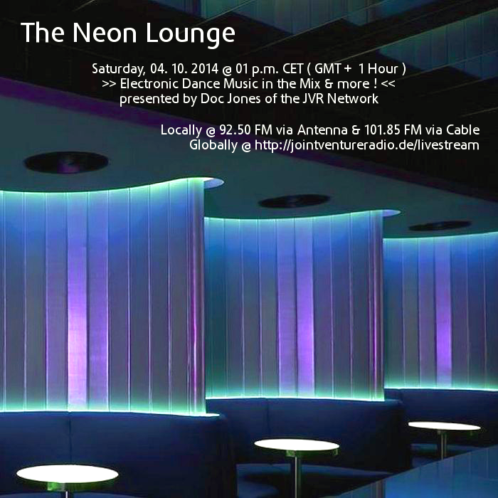 Am Sa., den 04. Oktober von 13 bis 15 Uhr wird es die Sendung „The Neon Lounge“ – live und direkt aus dem „Ivory Tower“ Studio in Bremen-Grohn – mit einem neuen DJ Mix und noch einigen von Doc Jones individuell ausgewählten und präsentierten Stücken geben! 😀