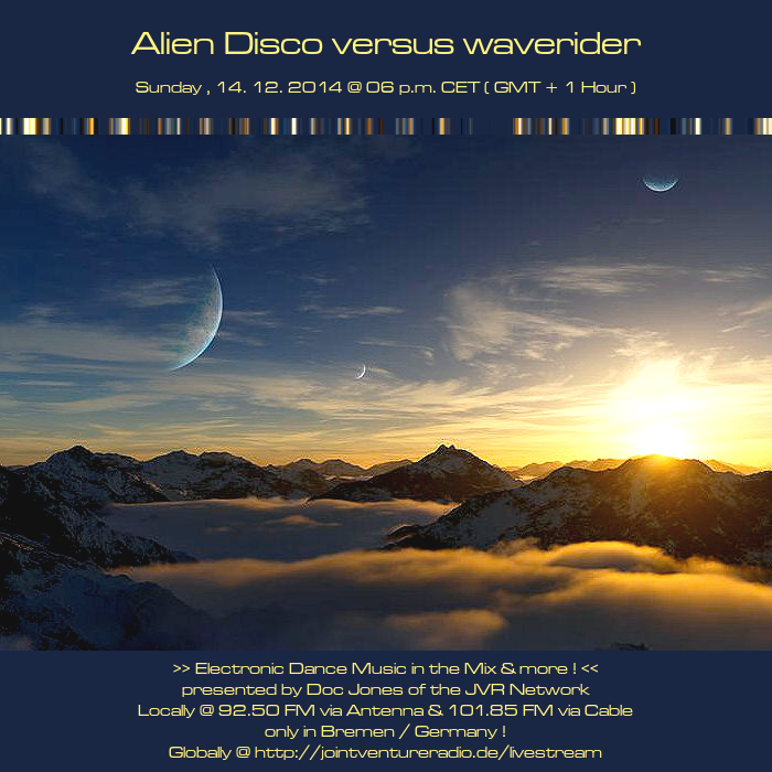 Am So., den 14. Dezember von 18 bis 20 Uhr wird es die Sendung „Alien Disco versus waverider“ – live und direkt aus dem „Ivory Tower“ Studio in Bremen-Grohn – mit einem neuen DJ Mix und noch einigen von Doc Jones individuell ausgewählten und präsentierten Stücken geben! 😀