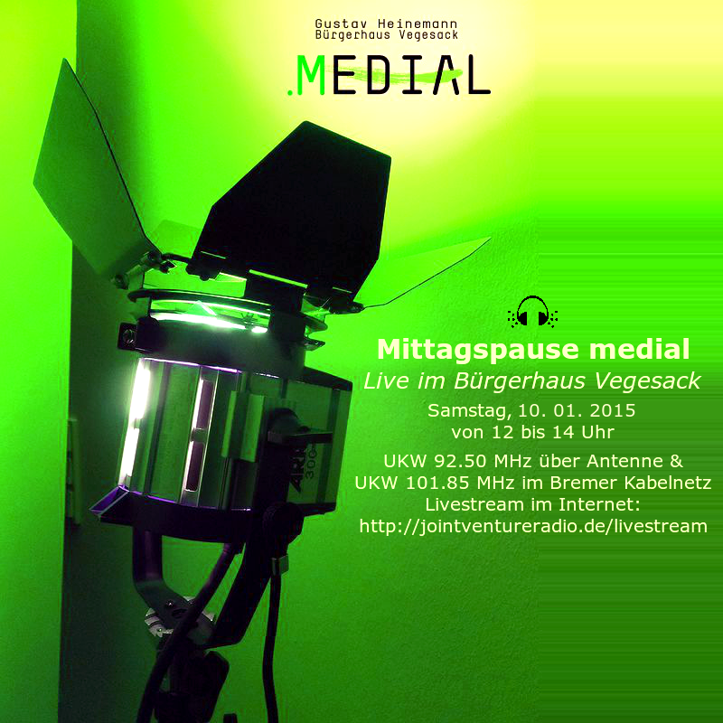 Am Sa., den 10. Januar von 12 bis 14 Uhr gibt es die Radiosendung „Mittagspause medial“ – live im Bürgerhaus Vegesack in Bremen-Nord! 😉