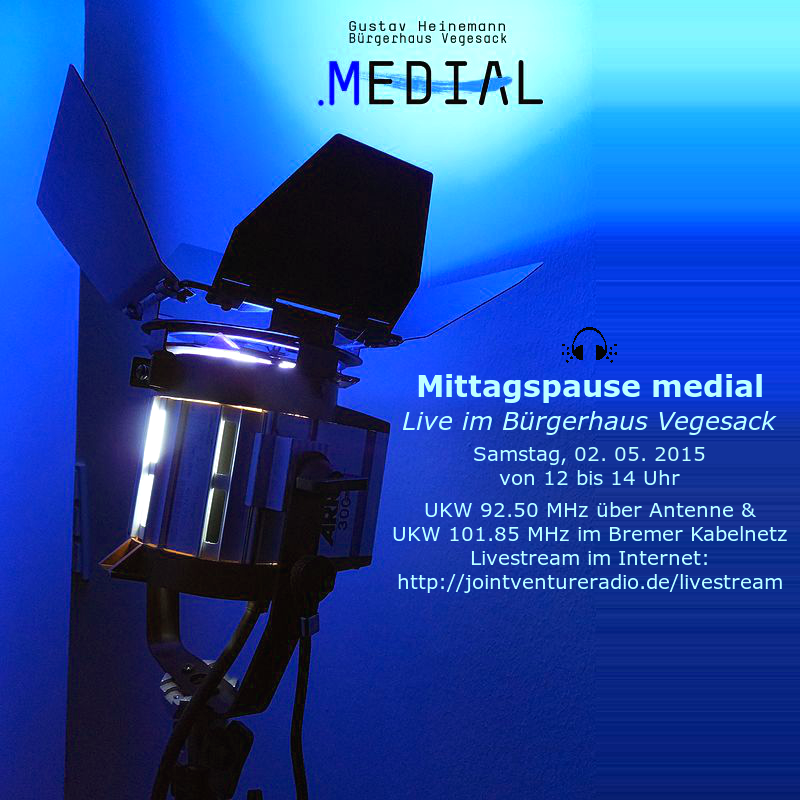 Am Sa., den 02. Mai von 12 bis 14 Uhr gibt es wieder die Radiosendung „Mittagspause medial“ – live im Bürgerhaus Vegesack in Bremen-Nord! 😉
