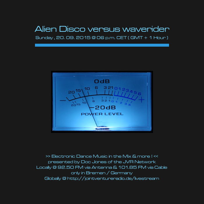 Am So., den 20. September von 18 bis 20 Uhr wird es die Sendung „Alien Disco versus waverider“ – live und direkt aus dem „Ivory Tower“ Studio in Bremen-Grohn – mit einem neuen DJ Mix und noch einigen von Doc Jones individuell ausgewählten und präsentierten Stücken geben! 😀