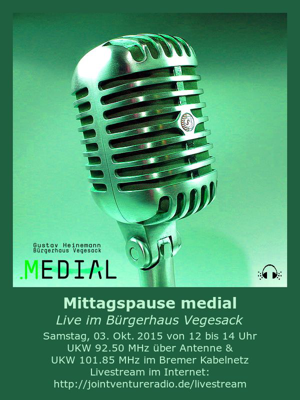 Am Sa., den 03. Oktober von 12 bis 14 Uhr gibt es wieder die Radiosendung „Mittagspause medial“ – live im Bürgerhaus Vegesack in Bremen-Nord mit Interview-Gästen und abwechslungsreicher Musik! 😉