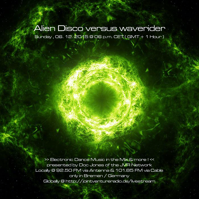 Am So., den 06. Dezember von 18 bis 20 Uhr wird es die Sendung „Alien Disco versus waverider“ – live und direkt aus dem „Ivory Tower“ Studio in Bremen-Grohn – mit einem neuen DJ Mix und noch einigen von Doc Jones individuell ausgewählten und präsentierten Stücken geben! 😀