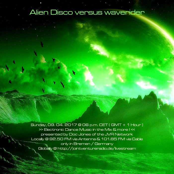 Am So., den 09. April von 18 bis 20 Uhr wird es die Sendung „Alien Disco versus waverider“ – live und direkt aus dem „Ivory Tower“ Studio in Bremen-Grohn – mit einem neuen DJ Mix und noch einigen von Doc Jones individuell ausgewählten und präsentierten Stücken geben! 😀