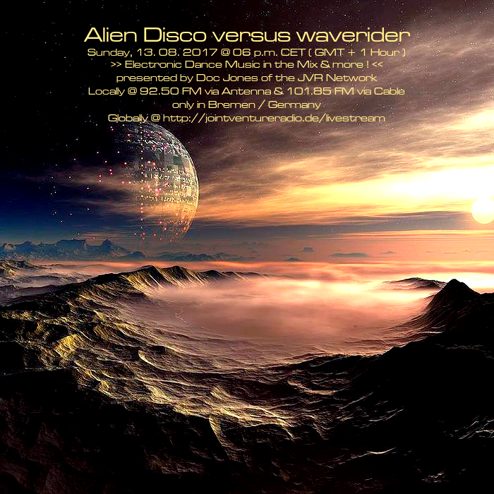 Am So., den 27. August von 18 bis 20 Uhr wird es die Sendung „Alien Disco versus waverider“ – live und direkt aus dem „Ivory Tower“ Studio in Bremen-Grohn – mit einem neuen DJ Mix und noch einigen von Doc Jones individuell ausgewählten und präsentierten Stücken geben! 😀