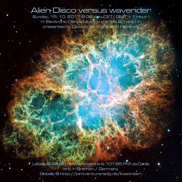 Am So., den 29. Oktober von 18 bis 20 Uhr wird es die Sendung „Alien Disco versus waverider“ – live und direkt aus dem „Ivory Tower“ Studio in Bremen-Grohn – mit einem neuen DJ Mix und noch einigen von Doc Jones individuell ausgewählten und präsentierten Stücken geben! 😀