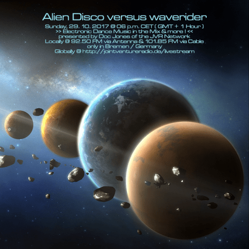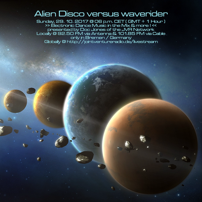 Am So., den 29. Oktober von 18 bis 20 Uhr wird es die Sendung „Alien Disco versus waverider“ – live und direkt aus dem „Ivory Tower“ Studio in Bremen-Grohn – mit einem neuen DJ Mix und noch einigen von Doc Jones individuell ausgewählten und präsentierten Stücken geben! 😀