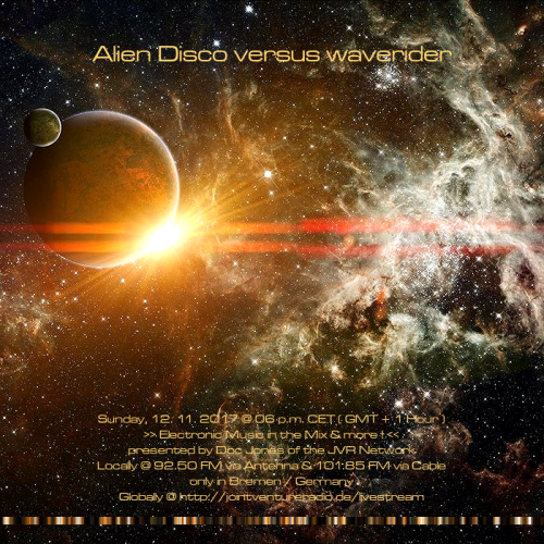 Am So., den 12. November von 18 bis 20 Uhr wird es die Sendung „Alien Disco versus waverider“live und direkt aus dem „Ivory Tower“ Studio in Bremen-Grohn – mit einem neuen DJ Mix und noch einigen von Doc Jones individuell ausgewählten und präsentierten Stücken geben! 😀