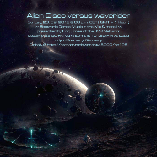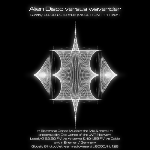 Am So., den 23. September von 18 bis 20 Uhr wird es die Sendung „Alien Disco versus waverider“ – live und direkt aus dem „Ivory Tower“ Studio in Bremen-Grohn – mit einem neuen DJ Mix und noch einigen von Doc Jones individuell ausgewählten und präsentierten Stücken geben! 😀