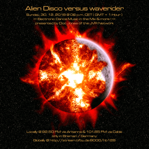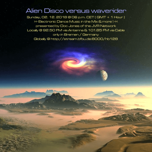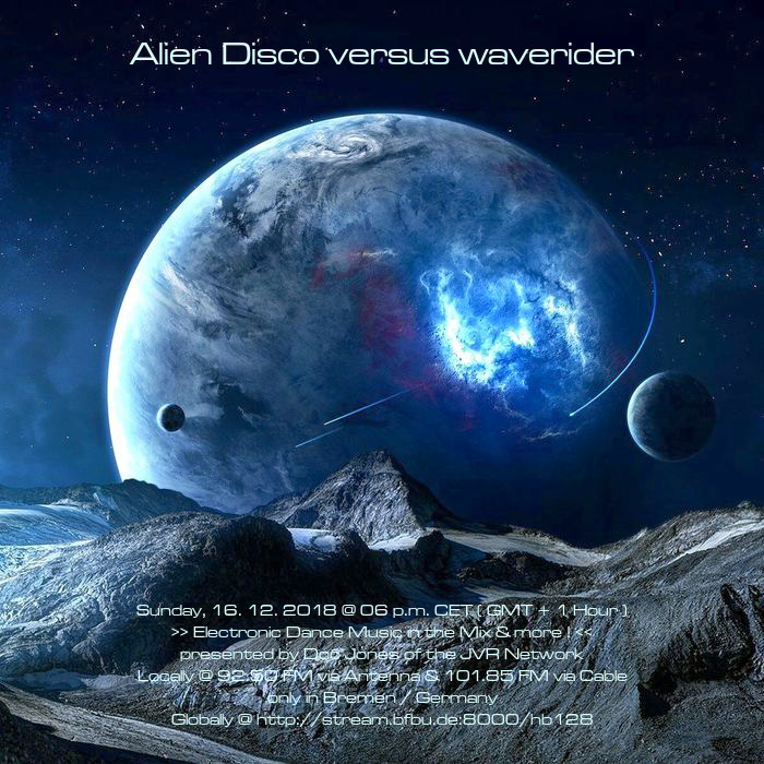 Am So., den 30. Dezember von 18 bis 20 Uhr wird es die Sendung „Alien Disco versus waverider“ – live und direkt aus dem „Ivory Tower“ Studio in Bremen-Grohn – mit einem neuen DJ Mix und noch einigen von Doc Jones individuell ausgewählten und präsentierten Stücken geben! 😀