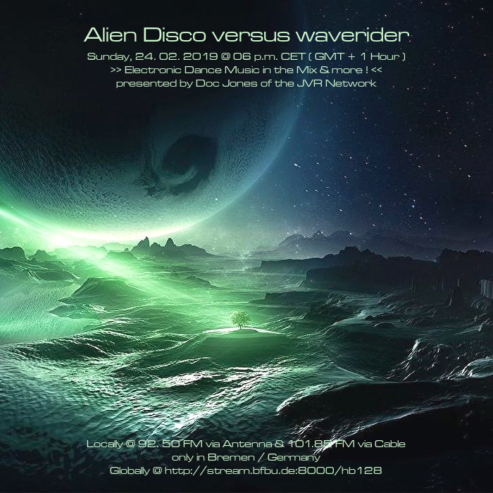 Am So., den 24. Februar von 18 bis 20 Uhr wird es die Sendung „Alien Disco versus waverider“ – live und direkt aus dem „Ivory Tower“ Studio in Bremen-Grohn – mit einem neuen DJ Mix und noch einigen von Doc Jones individuell ausgewählten und präsentierten Stücken geben! 😀