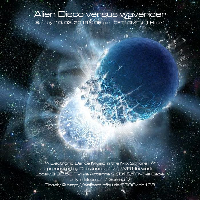 Am So., den 10. März von 18 bis 20 Uhr wird es die Sendung „Alien Disco versus waverider“ – live und direkt aus dem „Ivory Tower“ Studio in Bremen-Grohn – mit einem neuen DJ Mix und noch einigen von Doc Jones individuell ausgewählten und präsentierten Stücken geben! 😀