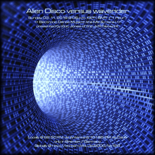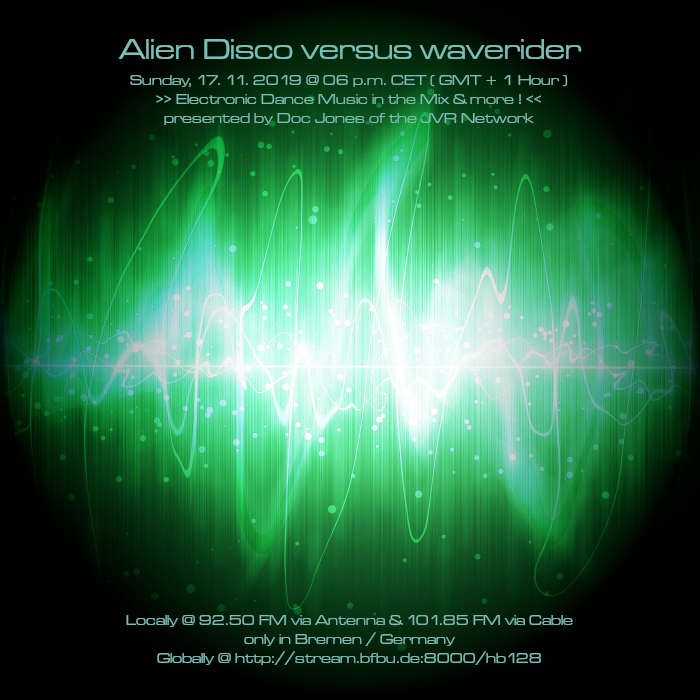Am So., den 17. November von 18 bis 20 Uhr wird es die Sendung „Alien Disco versus waverider“ – live und direkt aus dem „Ivory Tower“ Studio in Bremen-Grohn – mit einem neuen DJ Mix und noch einigen von Doc Jones individuell ausgewählten und präsentierten Stücken geben! 😀