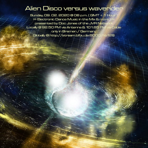 Am So., den 09. Februar von 18 bis 20 Uhr wird es die Sendung „Alien Disco versus waverider“ – live und direkt aus dem „Ivory Tower“ Studio in Bremen-Grohn – mit einem neuen DJ Mix und noch einigen von Doc Jones individuell ausgewählten und präsentierten Stücken geben! 😀