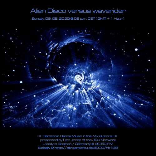 Am So., den 09. August von 18 bis 20 Uhr wird es die Sendung „Alien Disco versus waverider“ – live und direkt aus dem „Ivory Tower“ Studio in Bremen-Grohn – mit einem neuen DJ Mix und noch einigen von Doc Jones individuell ausgewählten und präsentierten Stücken geben! 😀