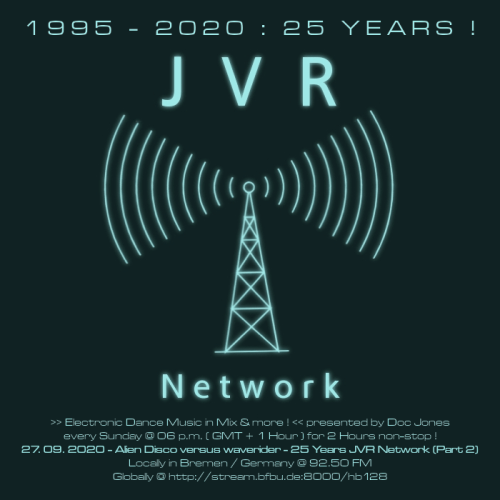 Am So., den 27. September von 18 bis 20 Uhr wird es die Sendung „Alien Disco versus waverider – 25 Years JVR Network (Part 1)“ – live und direkt aus dem „Ivory Tower“ Studio in Bremen-Grohn – mit einem neuen DJ Mix und noch einigen von Doc Jones individuell ausgewählten und präsentierten Stücken geben! 😀