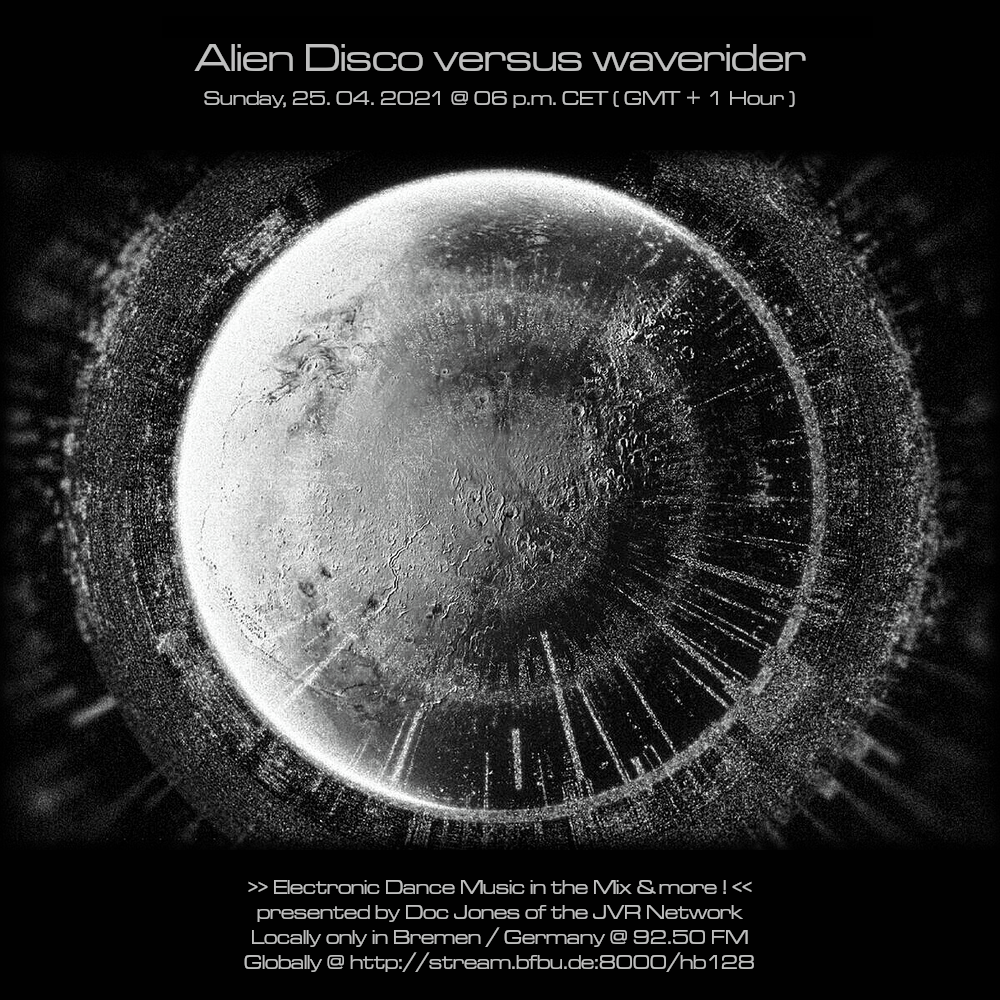 Am So., den 25. April von 18 bis 20 Uhr wird es die Sendung „Alien Disco versus waverider“ – live und direkt aus dem „Ivory Tower“ Studio in Bremen-Grohn – mit einem neuen DJ Mix und noch einigen von Doc Jones individuell ausgewählten und präsentierten Stücken geben! 😀
