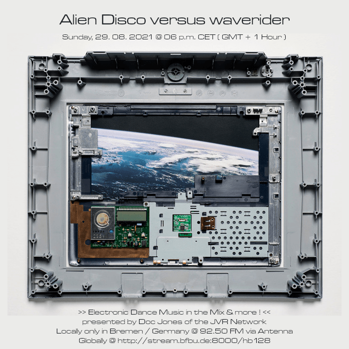 Am So., den 29. August von 18 bis 20 Uhr wird es die Sendung „Alien Disco versus waverider“ – live und direkt aus dem „Ivory Tower“ Studio in Bremen-Grohn – mit einem neuen DJ Mix und noch einigen von Doc Jones individuell ausgewählten und präsentierten Stücken geben! 😀