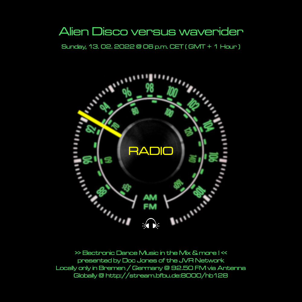 Am So., den 13. Februar von 18 bis 20 Uhr wird es die Sendung „Alien Disco versus waverider“ – live und direkt aus dem „Ivory Tower“ Studio in Bremen-Grohn – mit einem neuen DJ Mix und noch einigen von Doc Jones individuell ausgewählten und präsentierten Stücken geben! 😀