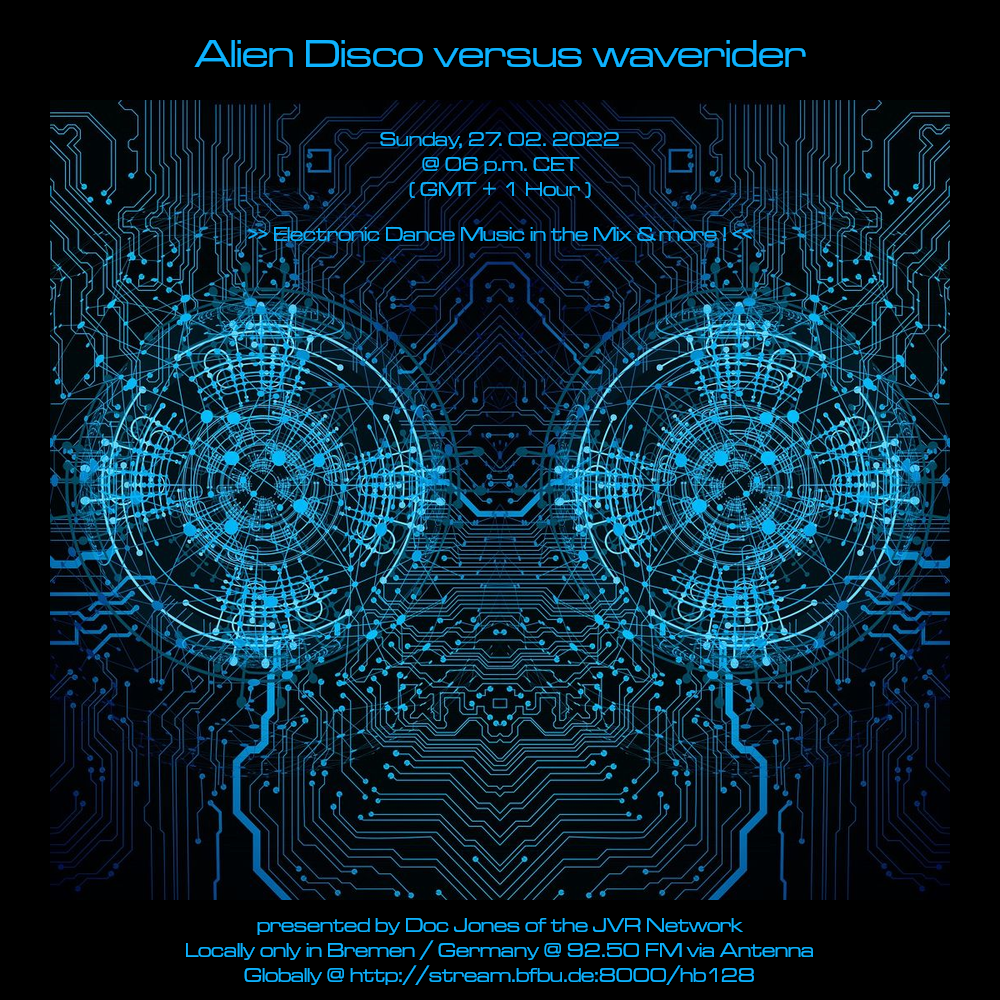Am So., den 27. Februar von 18 bis 20 Uhr wird es die Sendung „Alien Disco versus waverider“ – live und direkt aus dem „Ivory Tower“ Studio in Bremen-Grohn – mit einem neuen DJ Mix und noch einigen von Doc Jones individuell ausgewählten und präsentierten Stücken geben! 😀