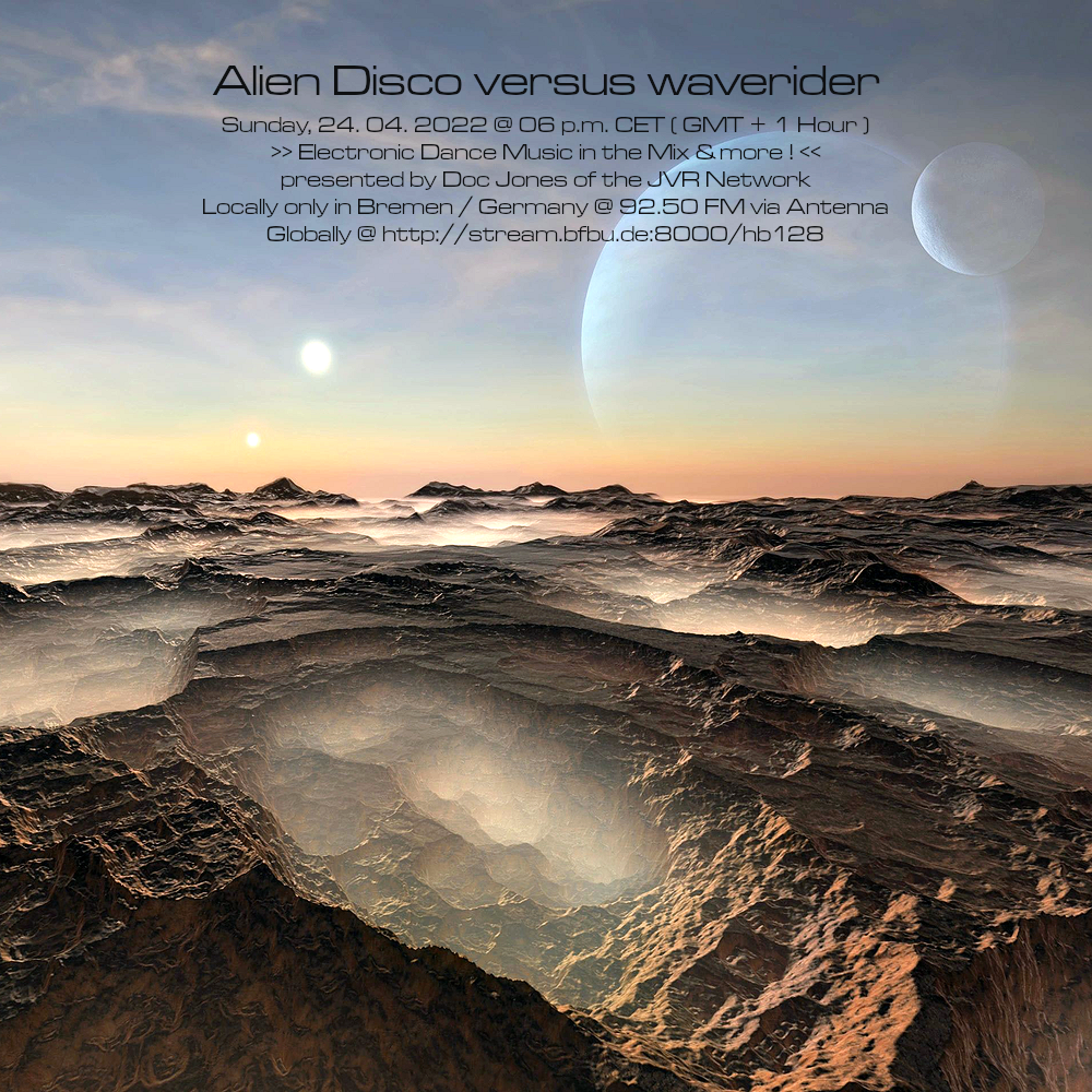 Am So., den 24. April von 18 bis 20 Uhr wird es die Sendung „Alien Disco versus waverider“ – live und direkt aus dem „Ivory Tower“ Studio in Bremen-Grohn – mit einem neuen DJ Mix und noch einigen von Doc Jones individuell ausgewählten und präsentierten Stücken geben! 😀