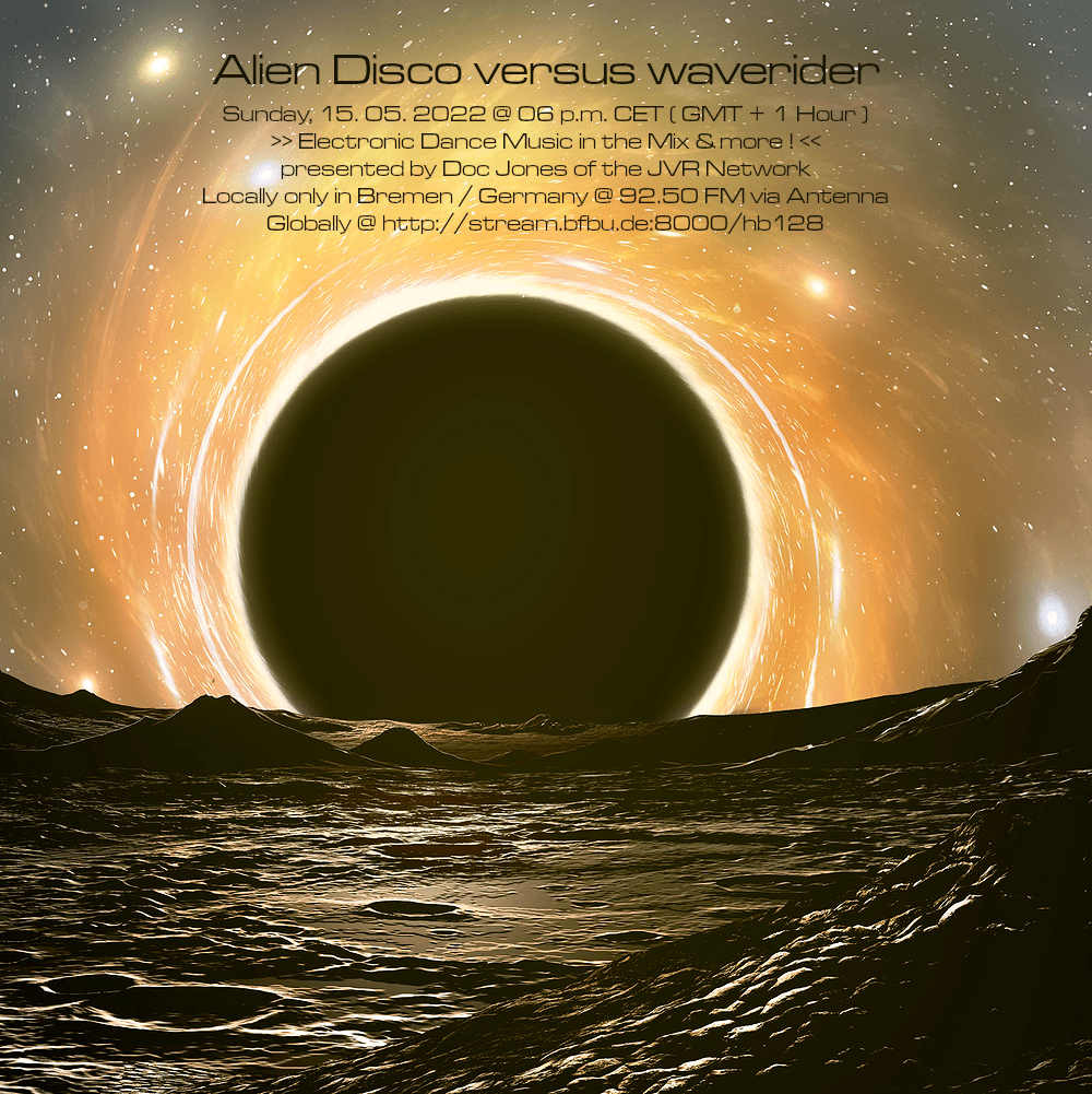 Am So., den 15. Mai von 18 bis 20 Uhr wird es die Sendung „Alien Disco versus waverider“ – live und direkt aus dem „Ivory Tower“ Studio in Bremen-Grohn – mit einem neuen DJ Mix und noch einigen von Doc Jones individuell ausgewählten und präsentierten Stücken geben! 😀
