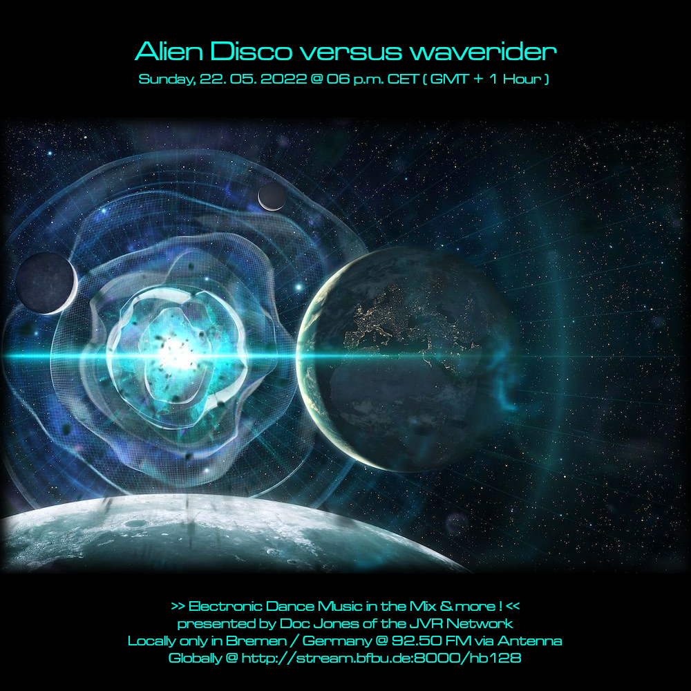 Am So., den 22. Mai von 18 bis 20 Uhr wird es die Sendung „Alien Disco versus waverider“ – live und direkt aus dem „Ivory Tower“ Studio in Bremen-Grohn – mit einem neuen DJ Mix und noch einigen von Doc Jones individuell ausgewählten und präsentierten Stücken geben! 😀