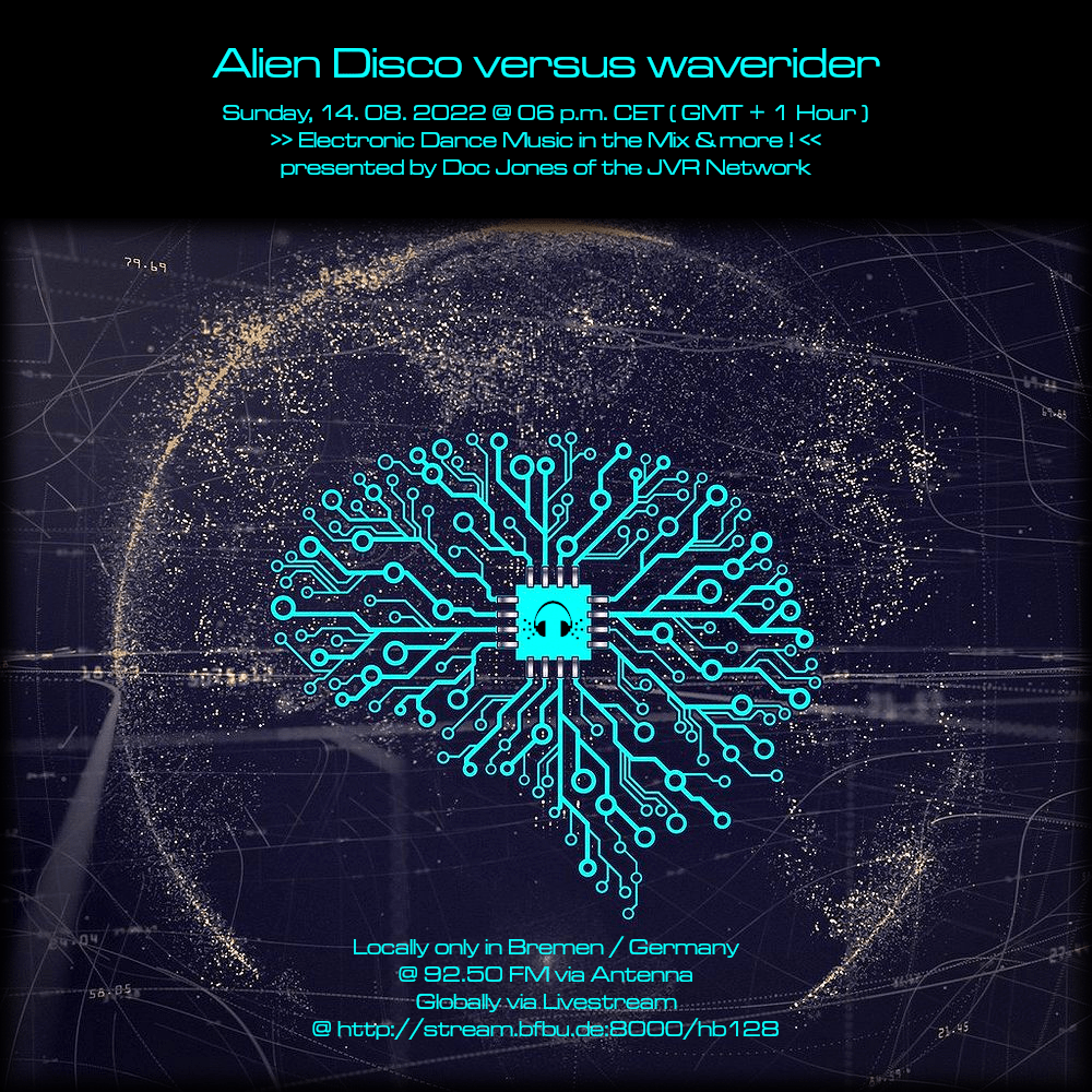 Am So., den 14. August von 18 bis 20 Uhr wird es die Sendung „Alien Disco versus waverider“ – live und direkt aus dem „Ivory Tower“ Studio in Bremen-Grohn – mit einem neuen DJ Mix und noch einigen von Doc Jonesindividuell ausgewählten und präsentierten Stücken geben! 😀