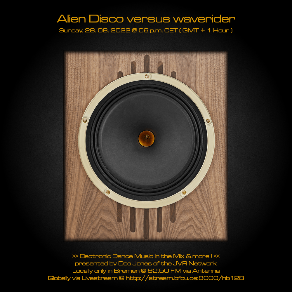 Am So., den 28. August von 18 bis 20 Uhr wird es die Sendung „Alien Disco versus waverider“ – live und direkt aus dem „Ivory Tower“ Studio in Bremen-Grohn – mit einem neuen DJ Mix und noch einigen von Doc Jonesindividuell ausgewählten und präsentierten Stücken geben! 😀