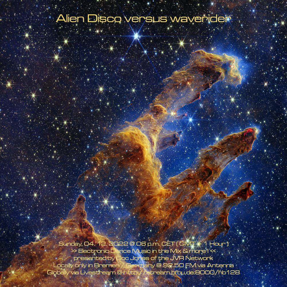 Am So., den 04. Dezember von 18 bis 20 Uhr wird es die Sendung „Alien Disco versus waverider“ – live und direkt aus dem „Ivory Tower“ Studio in Bremen-Grohn – mit einem neuen DJ Mix und noch einigen von Doc Jones individuell ausgewählten und präsentierten Stücken geben! 😀