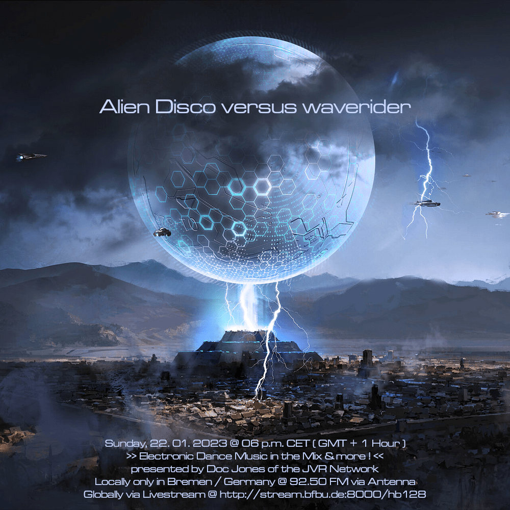 Am So., den 22. Januar von 18 bis 20 Uhr wird es die Sendung „Alien Disco versus waverider“ – live und direkt aus dem „Ivory Tower“ Studio in Bremen-Grohn – mit einem neuen DJ Mix und noch einigen von Doc Jones individuell ausgewählten und präsentierten Stücken geben! 😀