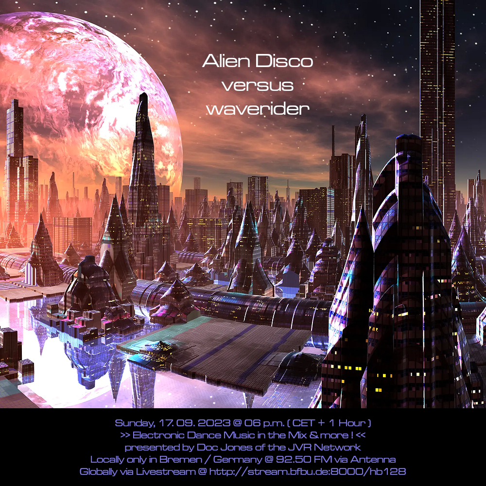 Am So., den 17. September von 18 bis 20 Uhr wird es die Sendung „Alien Disco versus waverider“ – live und direkt aus dem „Ivory Tower“ Studio in Bremen-Grohn – mit einem neuen DJ Mix und noch einigen von Doc Jones individuell ausgewählten und präsentierten Stücken geben! 😀