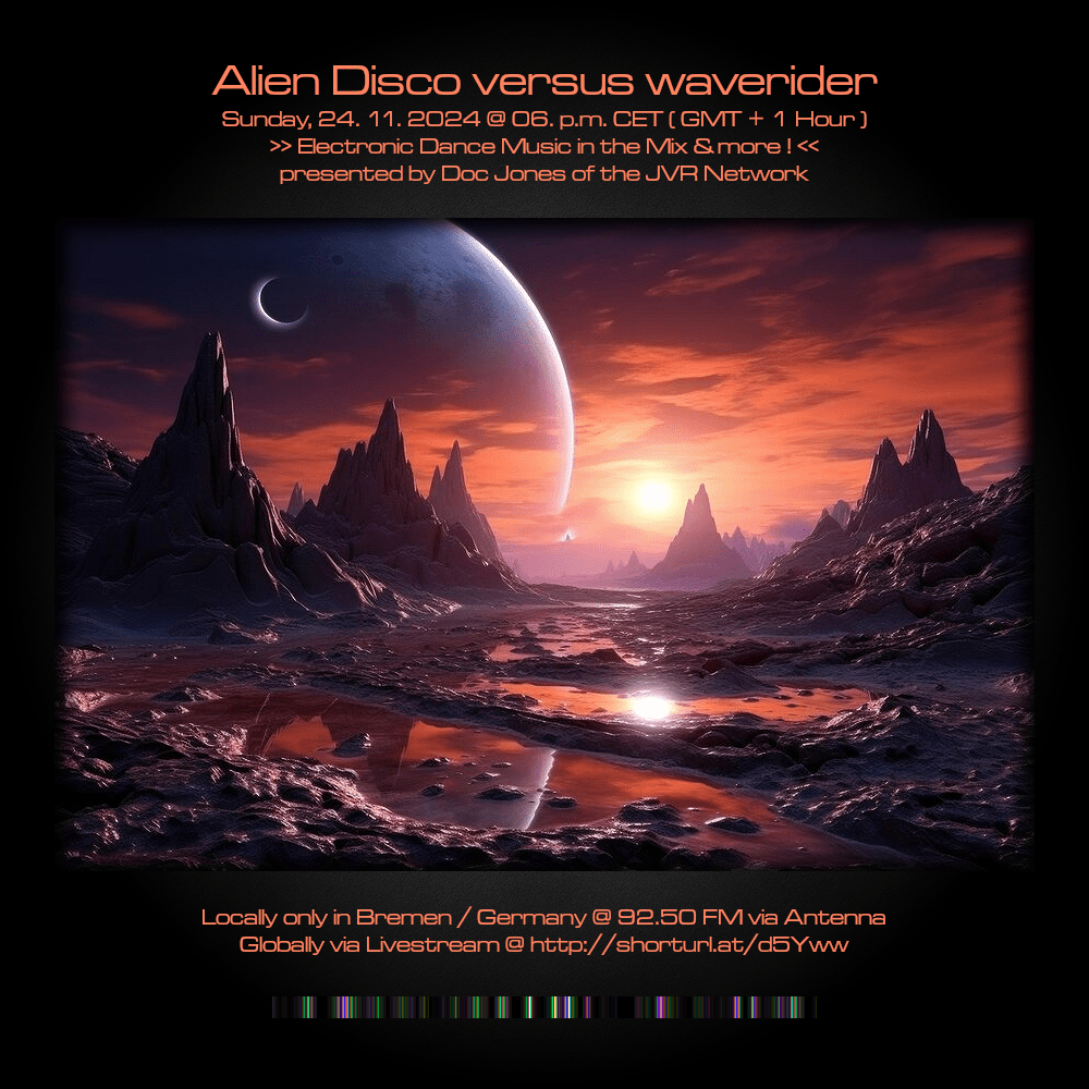 Am So., den 24. November von 18 bis 20 Uhr wird es die Sendung „Alien Disco versus waverider“ – live und direkt aus dem „Ivory Tower“ Studio in Bremen-Grohn – mit einem neuen DJ Mix und noch einigen von Doc Jones individuell ausgewählten und präsentierten Stücken geben! 😀
