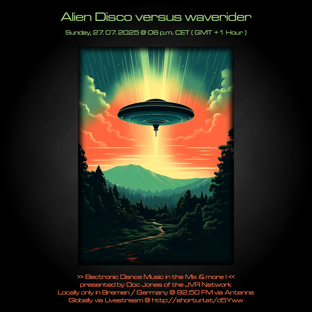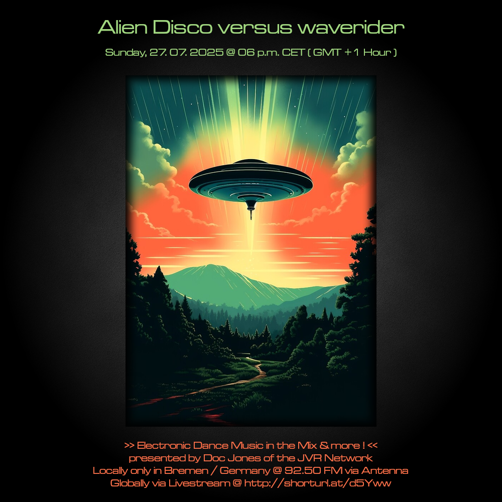 Am So., den 27. Juli von 18 bis 20 Uhr wird es die Sendung „Alien Disco versus waverider“ – live und direkt aus dem „Ivory Tower“ Studio in Bremen-Grohn – mit einem neuen DJ Mix und noch einigen von Doc Jones individuell ausgewählten und präsentierten Stücken geben! 😀