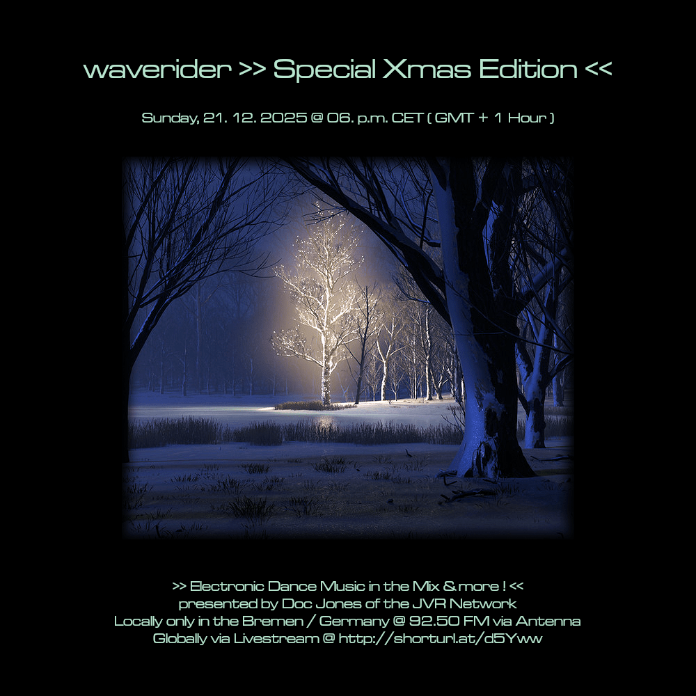 Am So., den 21. Dezember von 18 bis 20 Uhr wird es die Sendung „waverider >> Special Xmas Edition <<“ – live und direkt aus dem „Ivory Tower“ Studio in Bremen-Grohn – mit vielen von Doc Jones individuell ausgewählten und präsentierten Stücken geben! 😀