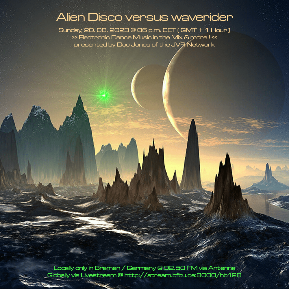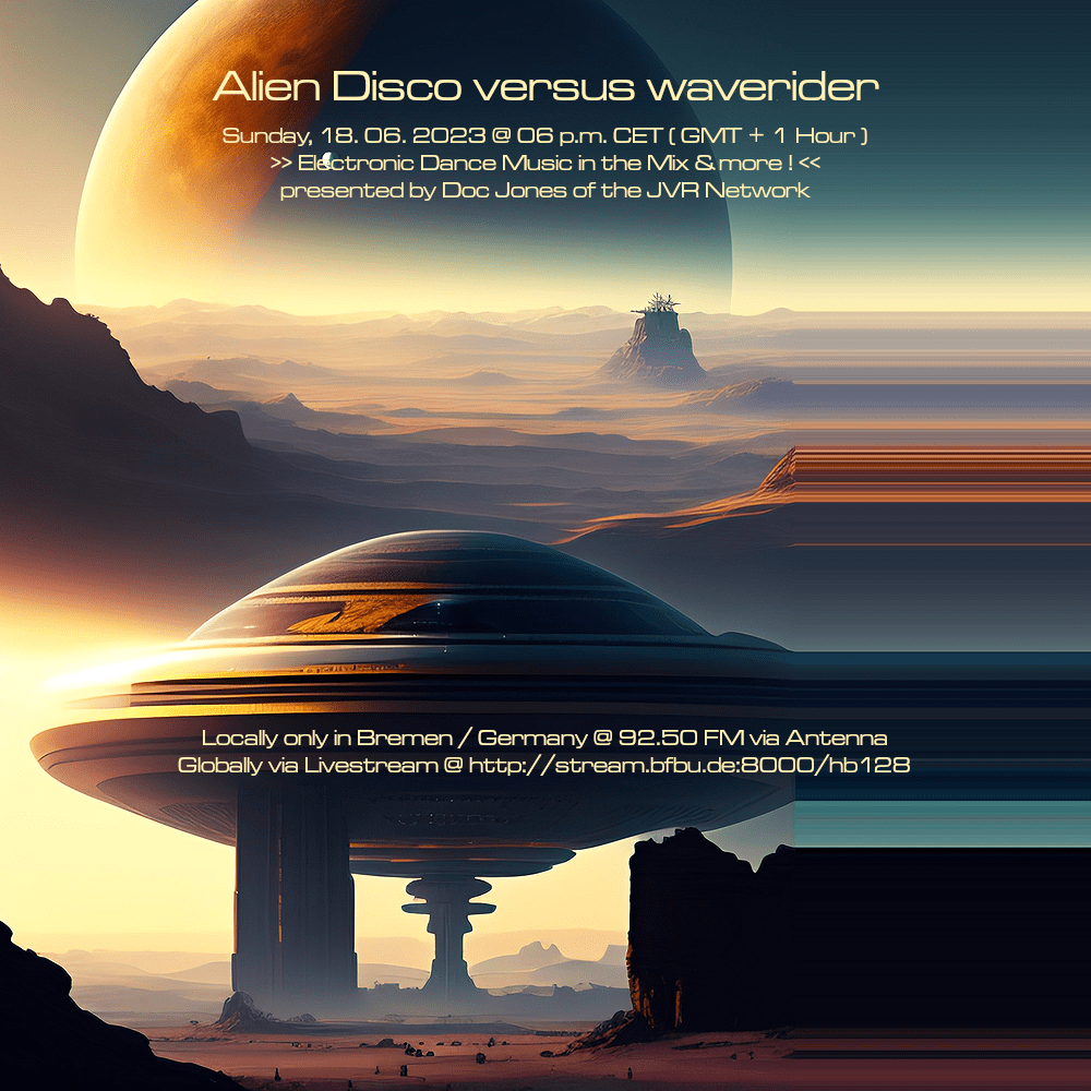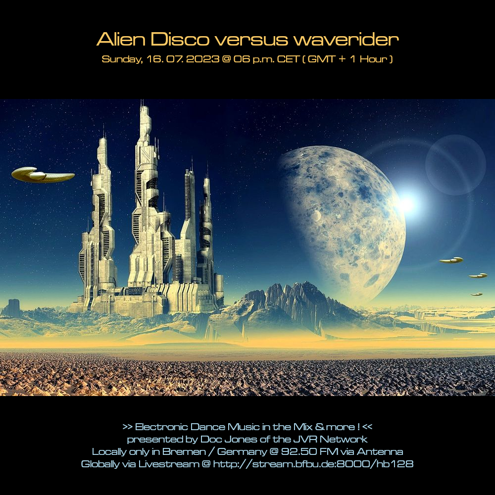 Am So., den 15. Oktober von 18 bis 20 Uhr wird es die Sendung „Alien Disco versus waverider“ – live und direkt aus dem „Ivory Tower“ Studio in Bremen-Grohn – mit einem neuen DJ Mix und noch einigen von Doc Jones individuell ausgewählten und präsentierten Stücken geben! 😀
