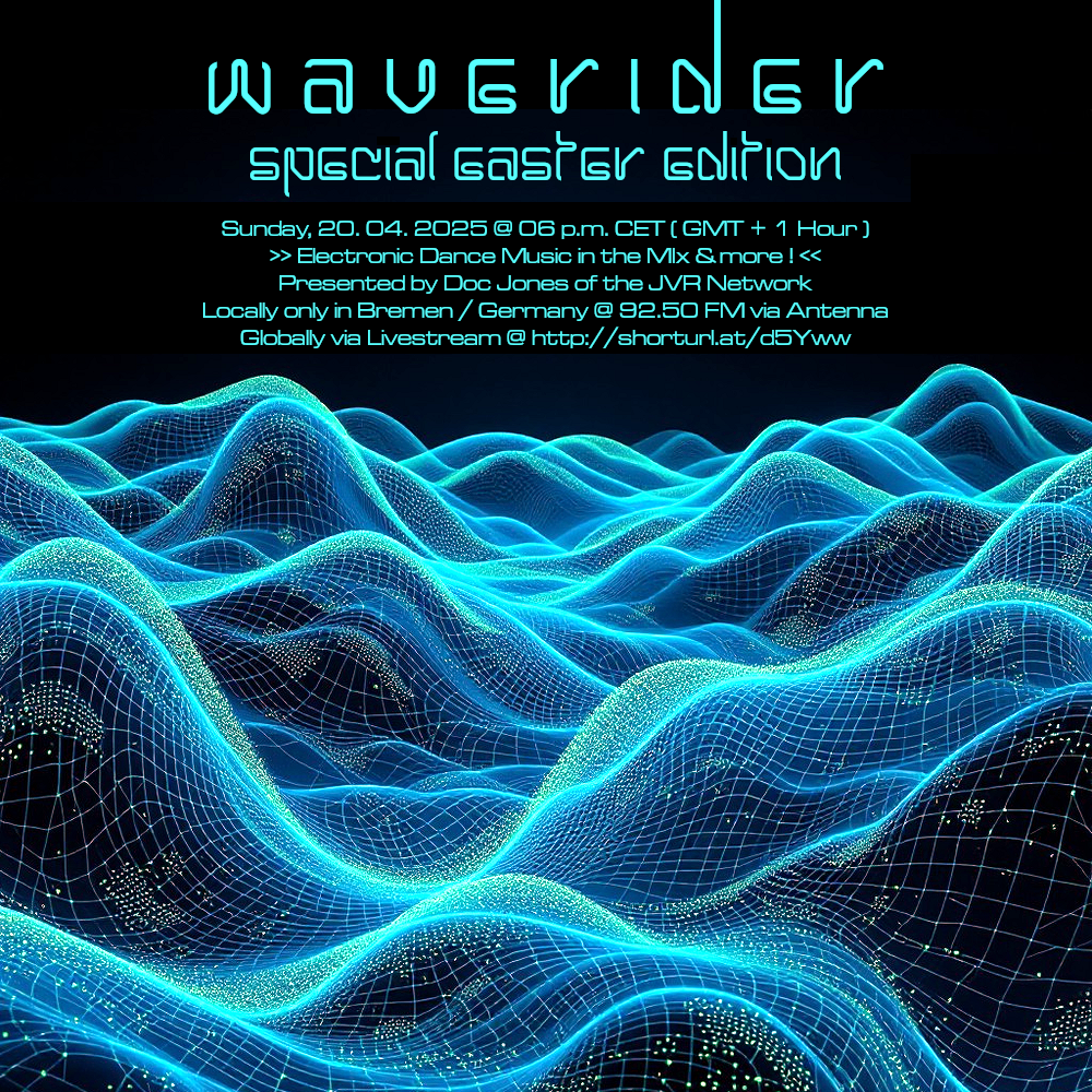 Am So., den 20. April von 18 bis 20 Uhr wird es die Sendung „waverider >> Special Easter Edition <<“ – live und direkt aus dem „Ivory Tower“ Studio in Bremen-Grohn – mit einem von Doc Jones individuell ausgewählten und präsentierten Programm geben! 😀