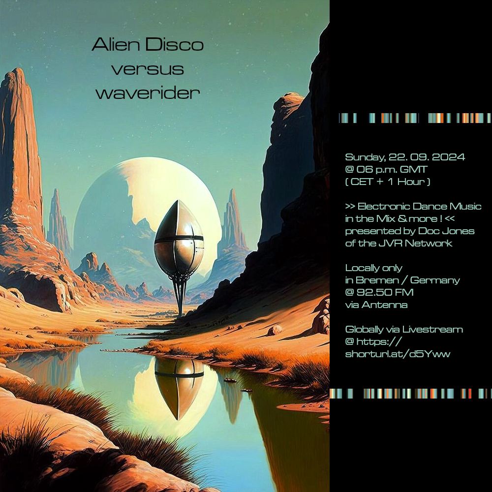 Am So., den 22. September von 18 bis 20 Uhr wird es die Sendung „Alien Disco versus waverider“ – live und direkt aus dem „Ivory Tower“ Studio in Bremen-Grohn – mit einem neuen DJ Mix und noch einigen von Doc Jones individuell ausgewählten und präsentierten Stücken geben! 😀