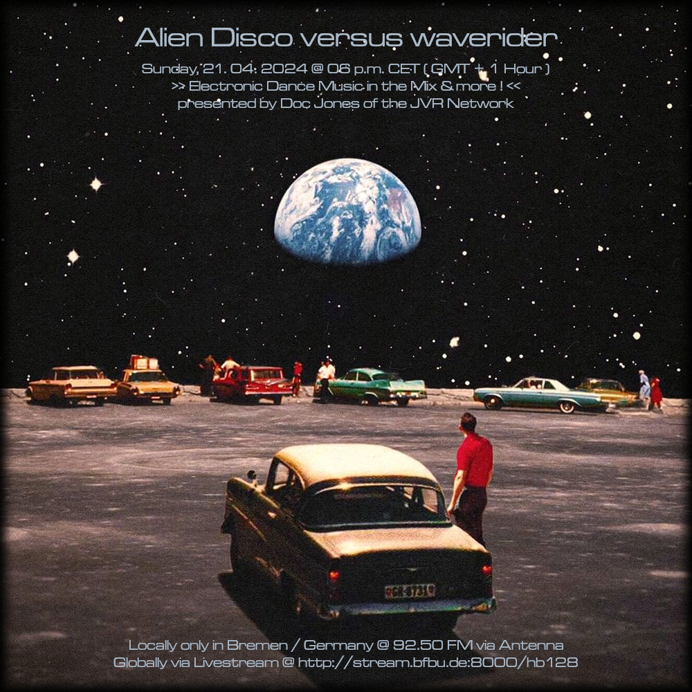 Am So., den 21. April von 18 bis 20 Uhr wird es die Sendung „Alien Disco versus waverider“ – live und direkt aus dem „Ivory Tower“ Studio in Bremen-Grohn – mit einem neuen DJ Mix und noch einigen von Doc Jones individuell ausgewählten und präsentierten Stücken geben! 😀
