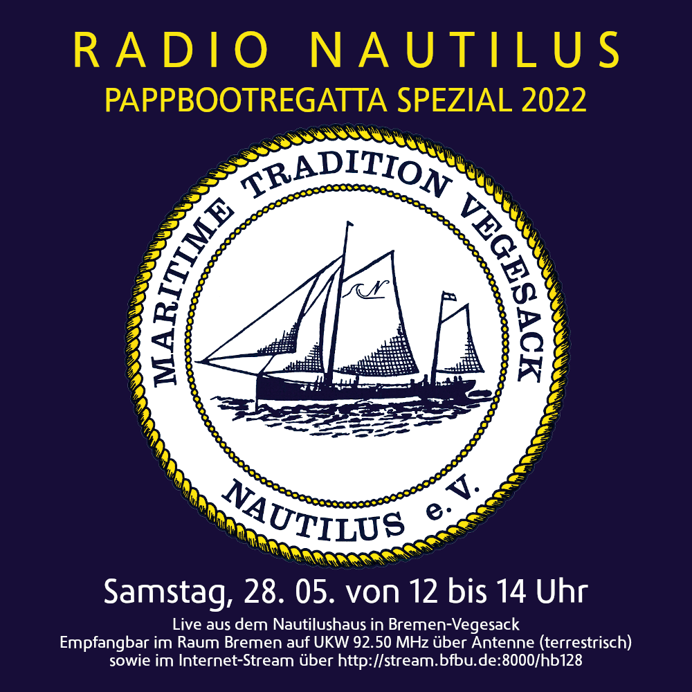Sa., 28. Mai von 12 bis 14 Uhr -> „Radio Nautilus – Pappbootregatta Spezial“ (Maritime Radiosendung mit diversen Interview-Gästen) live aus dem „Nautilushaus“ in Bremen-Vegesack von der dortigen Pappbootregatta!