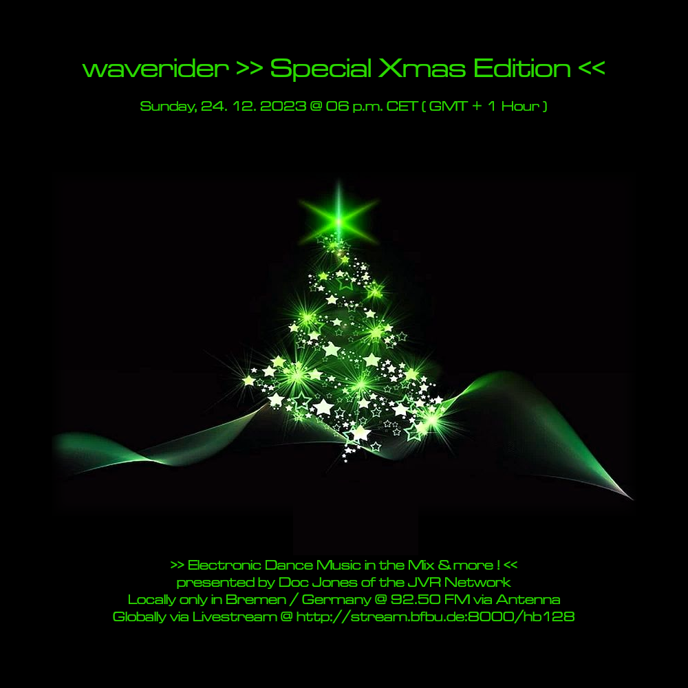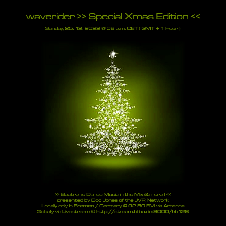 Am So., den 25. Dezember von 18 bis 20 Uhr wird es die Sendung „waverider >> Special Xmas Edition <<“ – live und direkt aus dem „Ivory Tower“ Studio in Bremen-Grohn – mit diversen von Doc Jonesindividuell ausgewählten und präsentierten Stücken geben! 😀